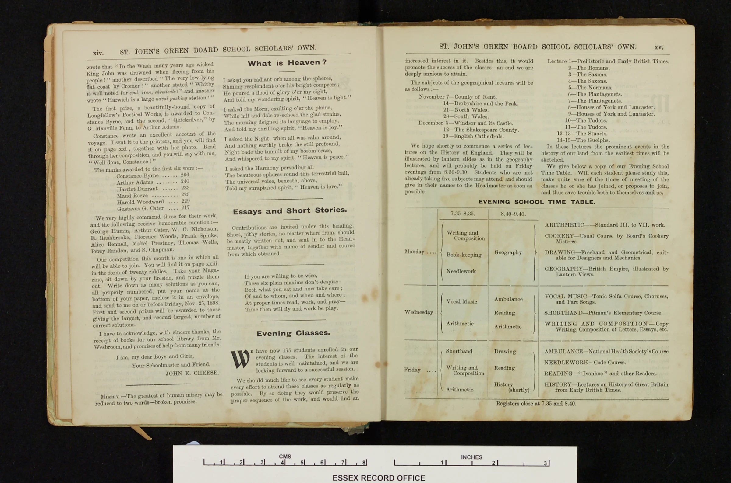 Evening classes had been running at St John's Green since 1898. They were set up to extend learning for recent leavers and adults and included the 3Rs, First Aid, Bookeeping and Vocal Music.